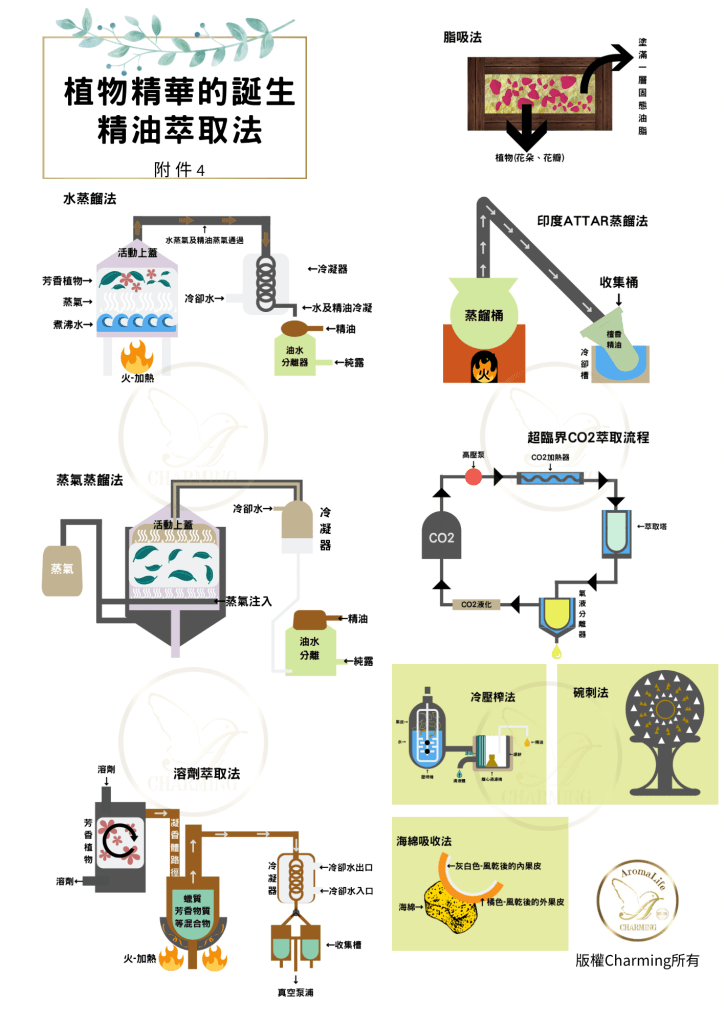 蒸氣蒸餾 (Steam Distillation) – 在此過程中,水放置於植物下方加熱,使水蒸氣向上通過植物後,將精油萃取而出,帶有精油的水蒸氣再經過導管冷凝成液體,透過比重的差異可將其分離成油層與水層,油層即是精油,水層即是純露(或稱花水),此為最常使用的蒸餾方式。